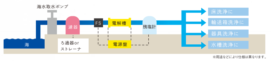 水道水と食塩による「人口殺菌海水」も製造することが可能です。お客さまのご希望に合わせた仕様設計製作を承ります。